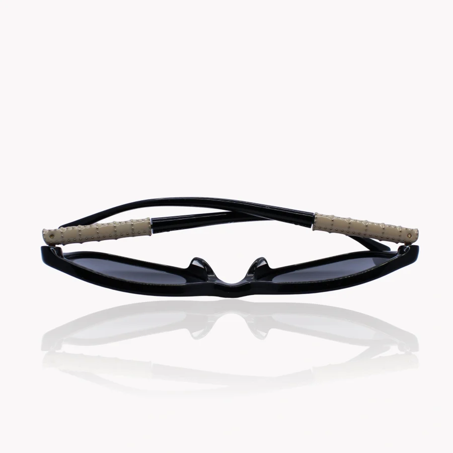 Collectors prize this model for its bold cat-eye silhouette, cream studded arms, and genuine polarized lenses.