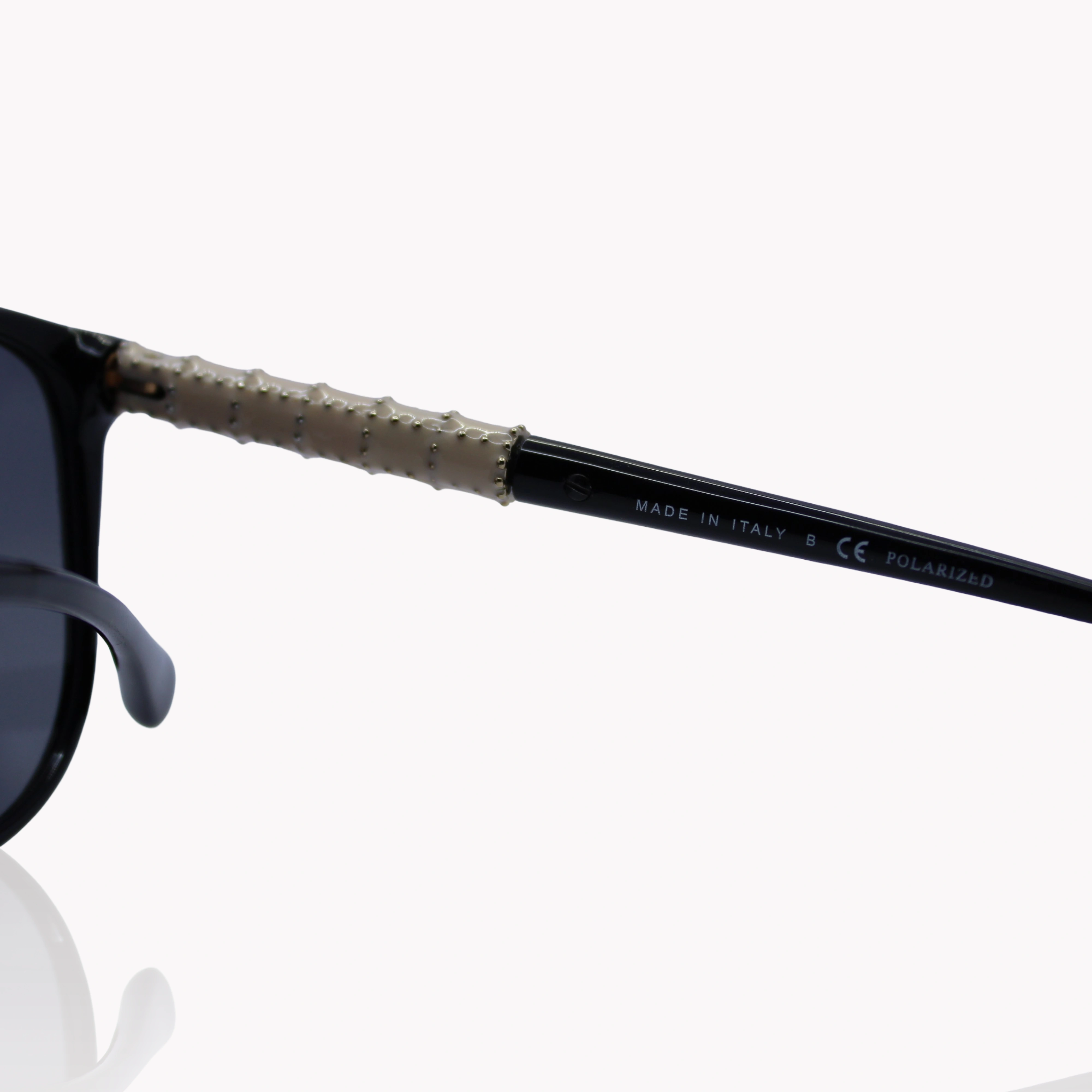 Collectors prize this model for its bold cat-eye silhouette, cream studded arms, and genuine polarized lenses.